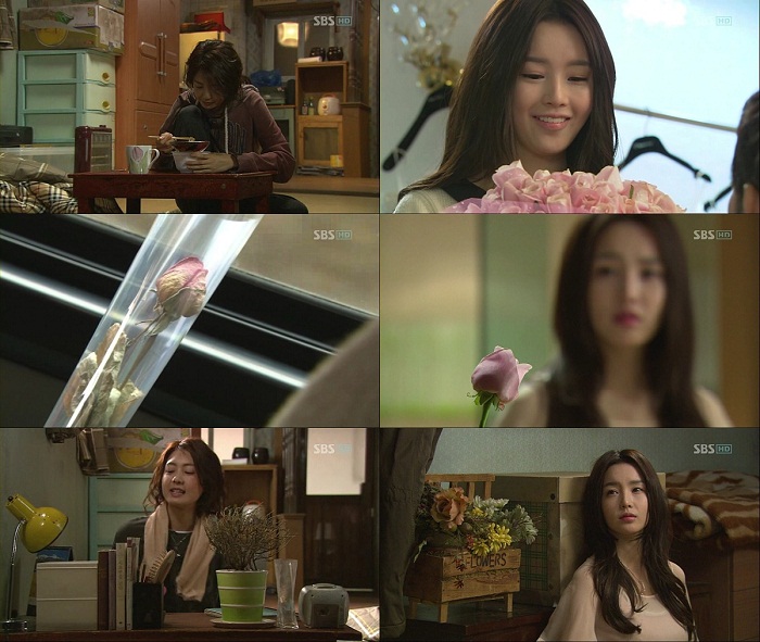 We got to see that the cup that Yi-Kyung is using has pink rose pattern on it. Although she seemed to be pretty lifeless, she might be once a cheerful girl like Ji-Hyun (judging from her outfits and her belongings in her treasure box), because in her house, she still keeps a pot of dry plant and a box of dried flowers. She also brought along a dried pink rose to the accident spot where her lover was involved with a fatal accident. Ji-Hyun, on the other hand, loves pink very much(to the extend that almost everything has some pink color on it) and that’s why(I think) she loves pink roses. She wore a pink rose hair clip on her engagement day. Min-Ho proposed her with a bouquet of pink roses. Han Gang also brought her a pink rose when he went to visit Ji-Hyun at the hospital, which Ji-Hyun saw after that.