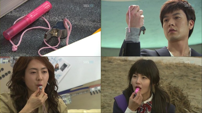 According to Ji-Hyun, her dad said that if something dangerous happens, blow the whistle so that if someone hears you, then you’ll be safe. Ermm..not in all cases, I think. But then, Yi-Kyung (coincidentally? Don’t think so~) has one in her treasure box, so Ji-Kyung put it in her bag, which (once again) Han Gang discovers about it.