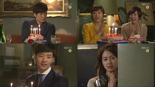 HG looks so uncomfortable with people celebrating his birthday (he looks like a child told to do something he doesn’t like) and JK hides behind the wall, singing for him too. Awww~ Then, comes the best moment: when JK returns IJ’s thermos that she brought to MH’s house in front of everyone, as something to spark others’ interest on IJ-MH’s relationship. You go, girl!