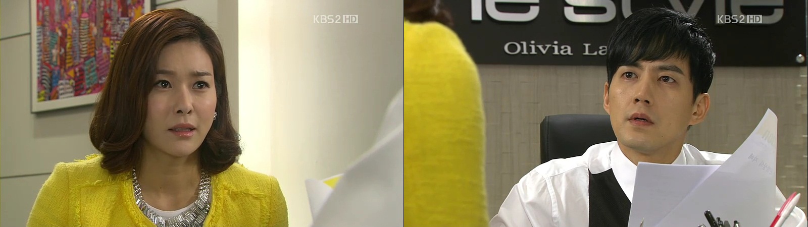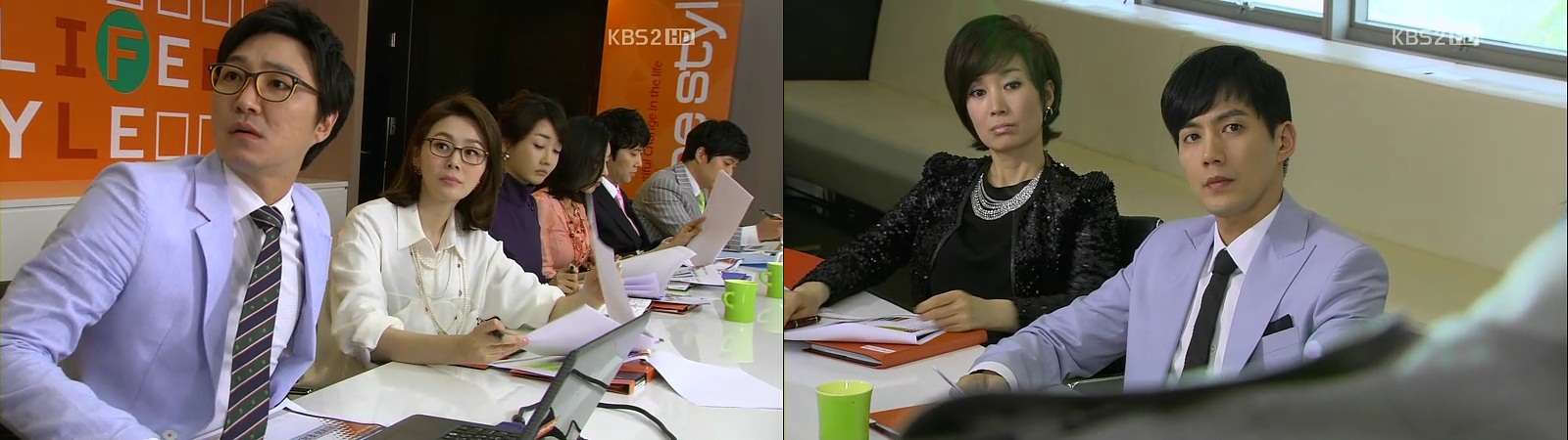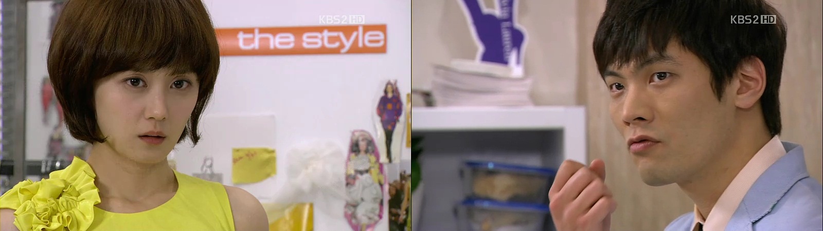They return to the design department, where a presentation is being held and So-Young is the model. Jin-Wook eyes her angrily all the time and shows her his fist, mumbling “You’re so going to die!” They keep staring at each other,fury in the eyes. Others are unaware of both of them.