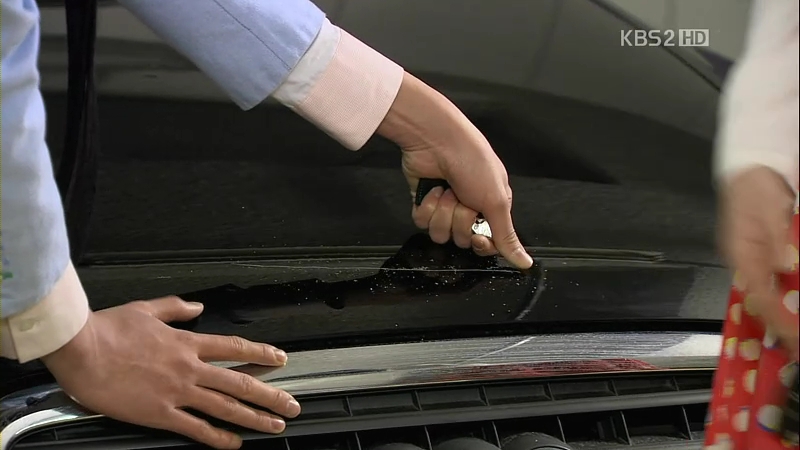 Jin-Wook begins scratching the polished car until it leaves there a very long scratch. So-Young tries to stop him, saying that this is really not her car but he ignores her. They are interrupted by somebody’s presence : Seung-Il, the real owner of the car.