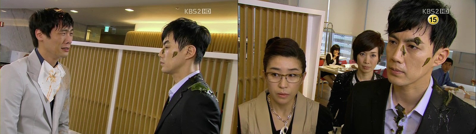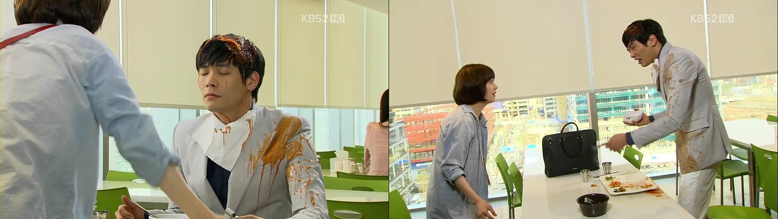She pours the kimchi onto his head and it stains his newly bought suit. His temper is now have been pushed to the limit and he throws the seaweed soup to her, except that he misses her.