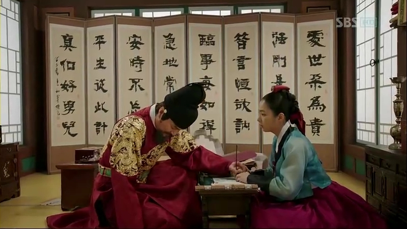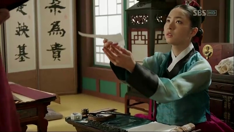 She gives him what she got from the dead scholar but Sejong is still absorbed in his thinking about the murders. He blames himself for every murder that’s happening and believes that he should be the one to be held responsibility for everything that happens in Joseon as he’s the king. He gets furious when So-Yi tells him that it’s not his responsibility. She writes the sentence over and over again, and Sejong pushes the paper away each time she does that.