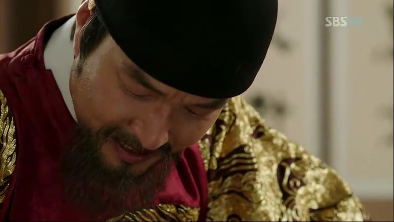 Unable to hold himself anymore, he collapses on his knees, crying. So-Yi, tears streaming down her face, tries to wipe off his tears, but he doesn’t let her to. He tells her not to cry for him and not to be easily shaken, for he’ll collapse if she does so. Sejong walks away, thinking about Ddol-Bok, whom So-Yi missed so much from her childhood as Dam-Yi, who has come to kill him.
