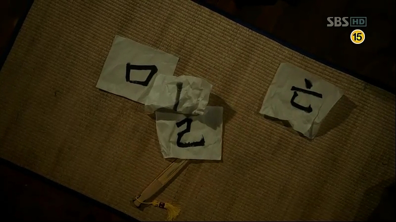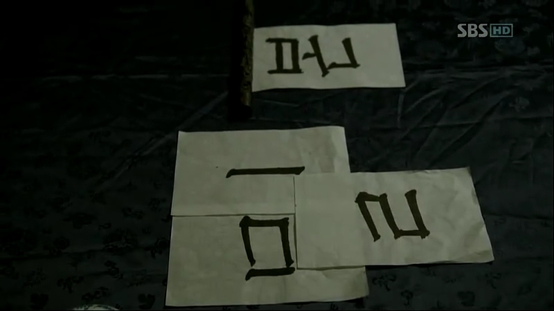 Scholar Shim yells in frustration when he discovers the real meaning behind the characters that annoys him: “the perished Mil”. The characters which are thought to be Hanja actually read another thing in Hangul when re-arranged. Sejong writes something derived from the last character left after the ‘mil’ has been constructed. He reads the word between his clenched teeth.