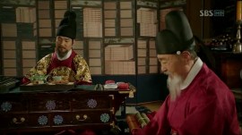 Prime Minister meets Sejong, and he clearly knows what Sejong has been doing all this time but he doesn’t tell anything to other officials. He suggests that Sejong halts his projects temporarily and shows what he should show to everyone. Outside, Minister Jo overhears and he faces Prime Minister to confirm it. He’s in conflict whether to support or to oppose what the king is doing as Taejong only ordered him to get rid of Mil-Bon.
