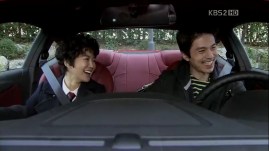 The first day: they decide to ignore each other’s presence at first but they have to ride Mu-Yeol’s red car together. Eun-Jae tries to ask him about the schedule but Mu-Yeol doesn’t want her to guard him and warns her not to kill him later. She decides to sit comfortably (i.e. lying down on the seat) since she practically doesn’t have to do anything. Well, he’s not going to let her go easily and steps on the brake when they encounter red light, sending Eun-Jae slipping flat onto the seat. She leisurely stomps her feet onto the shiny dashboard to get up, leaving her pretty shoes patterns on it.