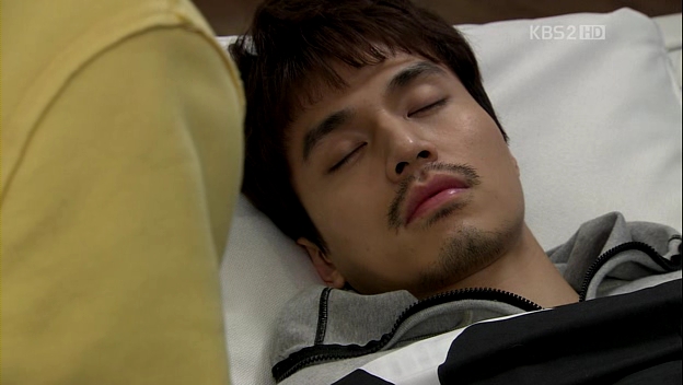 Mu-Yeol has fallen asleep on the couch as Eun-Jae is preparing his tea. She tries to wake him up, but fails. She brings out the comforter and tucks him under it. Again, she’s mesmerized by those pretty lips of Mu-Yeol and keeps looking at him. After much hesitation, she looks around and slowly leans in.