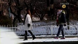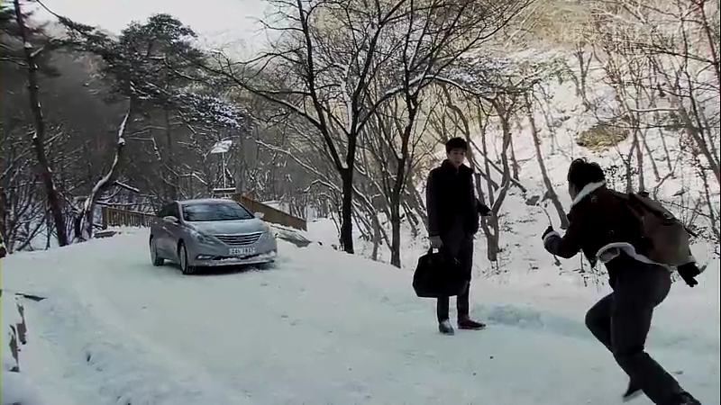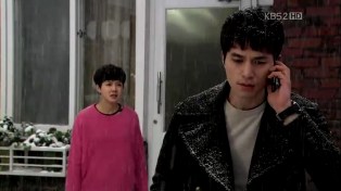 She sends him outside and starts to explain her reason, but Mu-Yeol gets a call from Manager Kim and completely ignores her. Eun-Jae isn’t going to let him go and throws a snowball at him. He looks at her with a questioning look while Dong-Ah’s puppy whimpers at them before walking off.