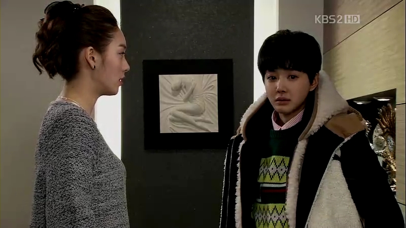 Mu-Yeol and the ahjumma arrives at her place and she informs him that her door password is the same as his. He looks around and regards that she has high taste in decorating her house. She goes inside and starts fixing her hair. She’s about to put on some lipstick (ewwww that’s totally gross!) but soon cancels her intention to do so. Eun-Jae is still fighting over the kids but she’s soon knocked down and being kicked around (I hate to see her like that ㅜㅜ). She starts apologizing to the kids when they step on her, but they run away when the policemen come with Jong-Hee.