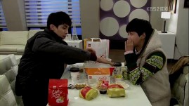 Eun-Jae informs Mu-Yeol about what Dong-Ah has been doing: following Yoon-Yi in disguise. They talk over dinner which Mu-Yeol ordered for takeaway. He treats her nicely and passes everything that she wants, looking like a faithful boyfriend. They are about the start another argument (Eun-Jae says Jong-Hee is artistic bullshit LOL) but again, Eun-Jae threatens him about the bodyguard position. Mu-Yeol turns into the nice boyfriend mode again (they look like they’re on a date or something!) and stuffs Eun-Jae’s mouth with a chicken. hahaha! He tells her to remind Dong-Ah to be careful when she’s around Yoon-Yi.