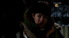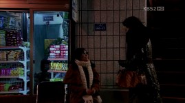 The two girls are at a cafe and Mu-Yeol walks towards Jong-Hee to make sure she’s okay, but the scratch on her face makes him worry and he starts to accuse Eun-Jae of not doing her job. Jong-Hee tries to stop him, but he just gets angrier. Eun-Jae walks away, limping with her legs hurt. Jong-Hee goes out after her and Mu-Yeol too. Eun-Jae ignores him and walks away while crying. Mu-Yeol lifts her up in a cradle and carries her towards a taxi while she’s screaming for him to put her down. She cries in the taxi, with Jong-Hee looking at her.