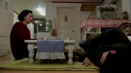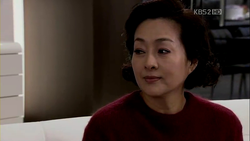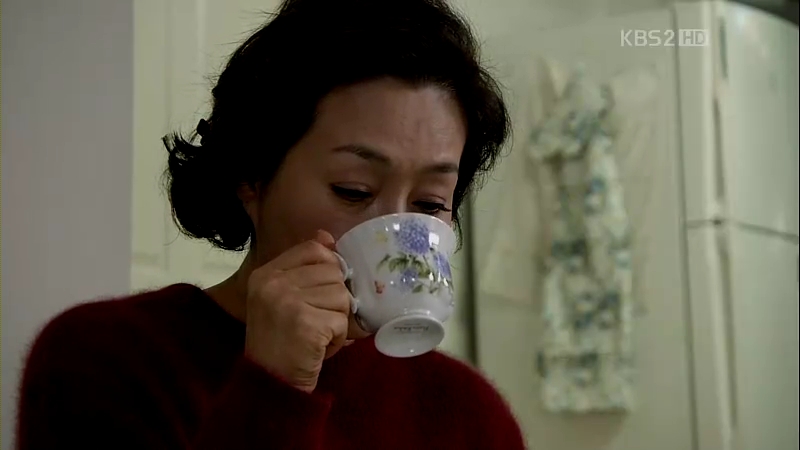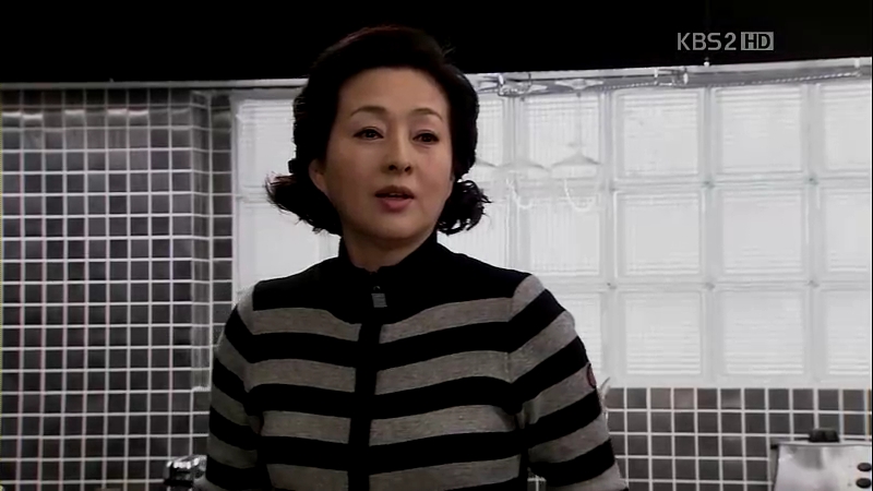 Eun-Jae comes over the next day to see how he’s doing, but the ahjumma says he can’t see anyone. Eun-Jae wants to meet him only for a brief second and the ahjumma goes inside to ask Mu-Yeol about it, while actually she doesn’t. She cooks up a lie and tells Eun-Jae he isn’t seeing anyone (Liar! Grrr!). She’s as happy as a lark to be able to take care of her wounded lover, smiling triumphantly. Okay, typing this makes me want to vomit. Ewwwww…