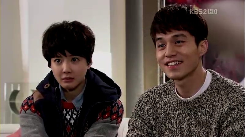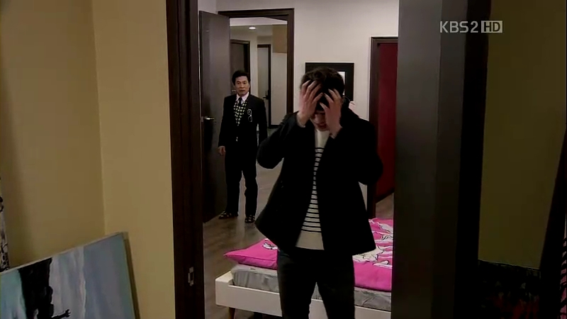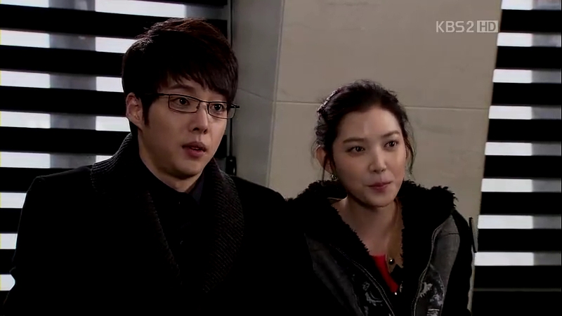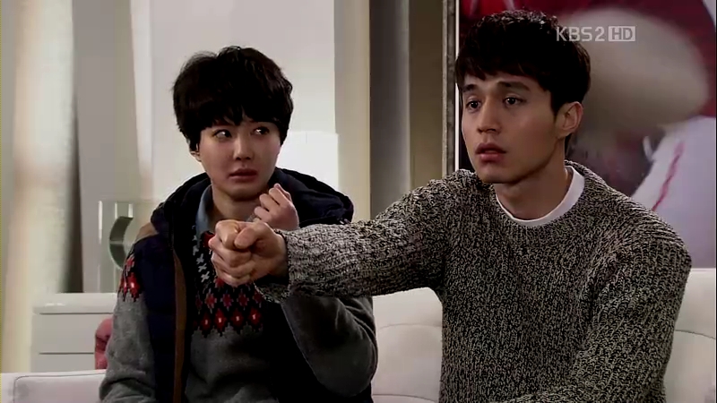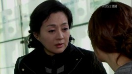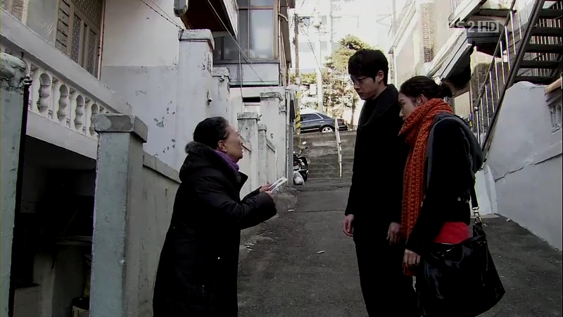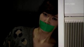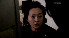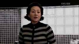 The ahjumma has done a very nice trick this time: changing the outfits of Jong-Hee and Eun-Jae with each other, except for their shoes. They are tied up and she proceeds to investigate who is Mu-Yeol’s girl and stayed with him last night. Eun-Jae admits that it was her, but the ahjumma’s question about why Jong-Hee is still wearing the ring is left unanswered. She sees Mu-Yeol running towards the building through the windows and gets ready for her little ‘show’.