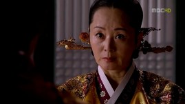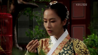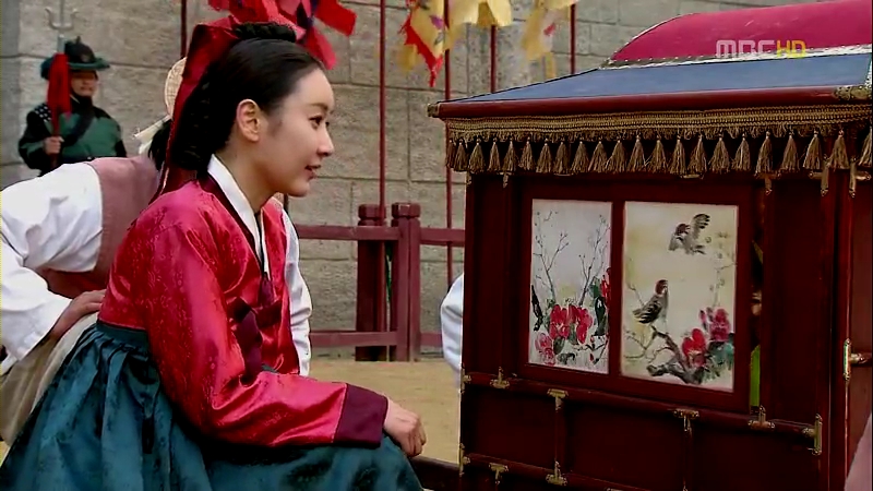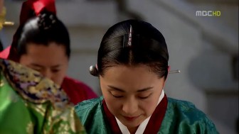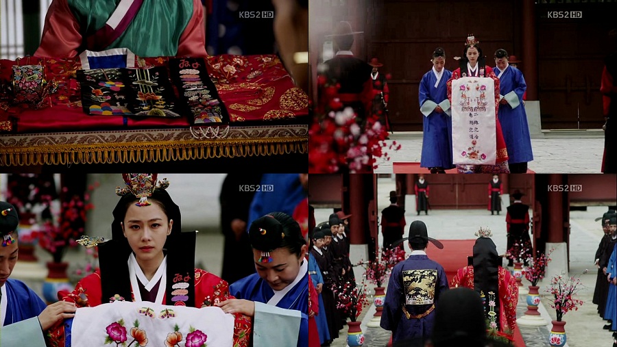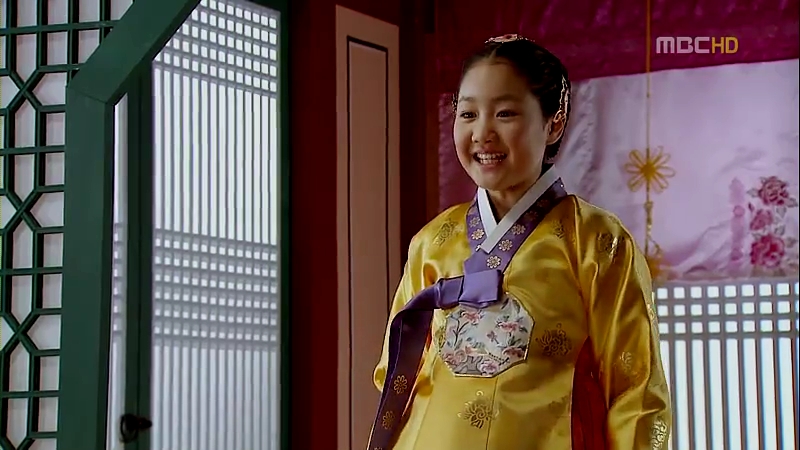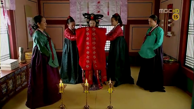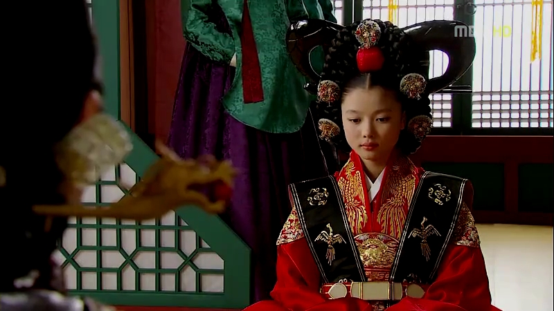 Princess Min Hwa’s dangui is less elaborate, probably because she’s still a girl, but for a more matured princess like Princess Kyung Hye, her dangui (which is worn by Se Ryung here) has more geumbak on it. Notice how they replace the dragon emblem with circular flower patterns for the princesses.