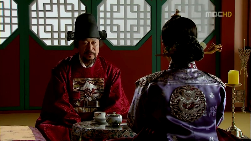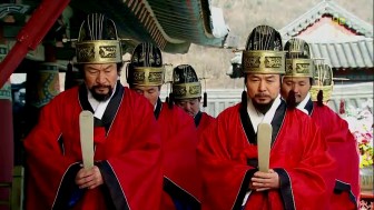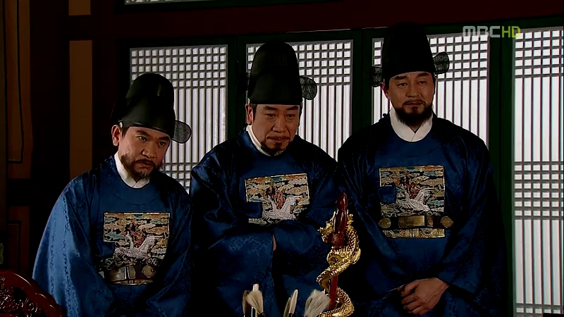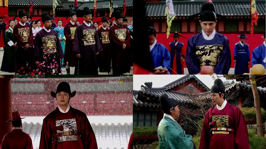 One look and you could tell who is more powerful than the others: Minister Yoon donning a red robe with two cranes on his rank badge while the three Physiognomy Ministers are all in blue robes with single crane on their rank badges. All of them are civil officers.