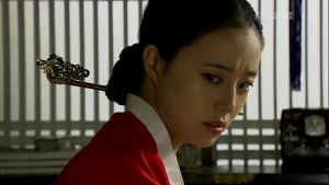 The next one: the most common style used by queens and the married princesses is jjeokjin meori (쪽진 머리), in which the hair is brought to the back and tied into a bun. A long hairpin is used to fasten the bun and also decorate the hair while showing the rank of the wearer. The generic term is binyeo (비녀), but the specific name differs according to the shape.