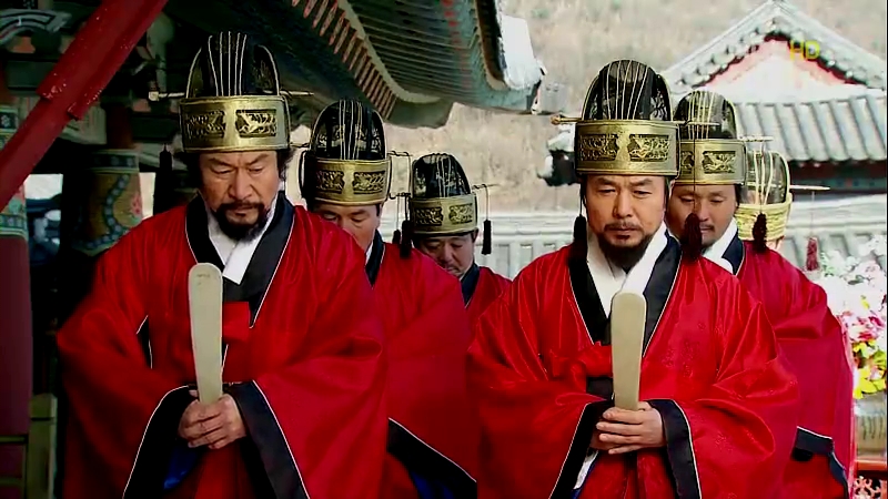 For the special ceremonies like announcement of royal decrees by the king, the officials will dress in a special red robe called jobok. A yanggwan, which is a crown with two tassels hanging from the long hairpin. In the picture above, all the ministers are holding scepters made of ivory.