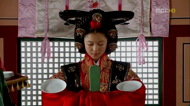 Jeokui is a blue ceremonial robe with red fabrics lined the collar until the lower hem and also the hem of the sleeves. Patterns of clouds and phoenixes are embroidered on the red linings while clouds and dragons on the blue parts. Most of the time, the princess or the queen will be holding a slab of white or greenish blue jade (depending on what their spouses are using) known as paeok or gyu just like this one. (picture credit: Princess Hours’ Soompi Forum)
