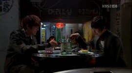 Jang-Il returns to Busan and the first thing he does is to meet Sun-Woo. He keeps telling him to go to Seoul with him istead of working in a factory, but Sun-Woo refuses and thanks him for his kind thought. Sun-Woo tells him about something he sent to Jang-Il but he haven’t received any. They go for a drink and talk about Jang-Il’s life in the college. He brags about the only thing that he has but others don’t: a friend like Sun-Woo who’s willing to do anything for him. Jang-Il tells him about the girl he’s interested in, and Sun-Woo wonders how the girl looks like. It’s your crush, dear Sun-Woo….