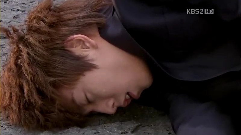 Jang-Il starts to think about what he should do next and he sees a piece of wood lying near him. He takes it and slowly walks towards Sun-Woo. He is still hesitating about it and walks quite unstably on the rocks, but he lifts the wood and gives Sun- Woo a hard blow on his head. The poor boy falls onto the hard ground, and Jang-Il gives another blow to make Sun-Woo half-conscious.