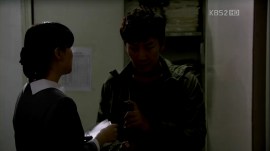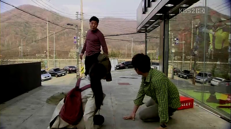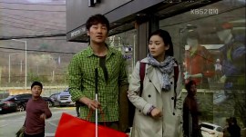 He accuses Sun-Woo of stealing his wallet and it turns out that Sun-Woo took his jacket by mistake. The man starts insulting him and Ji-Won gets angry at the man for accusing him like that. She tries to make him apologizes but Sun-Woo gets pushed by him. Ji-Won slaps him and she also gets pushed by him. She brings out some eggs from her backpack and throws them at the man. Sun-Woo can’t hold his anger anymore when Ji-Won falls because of the man and hits him with his cane.
