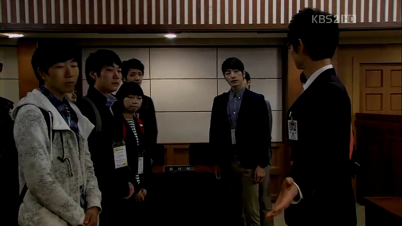 It looks like Jang-Il and his classmates are having a trip to the court to see what the real court looks like. As the lecturer explains the details, Jang-Il focuses on the prosecutor’s seat and the lecturer’s voice fades into his imagination.