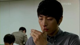 The clap is actually done by his classmates and he’s brought back to the reality. The tour ends and he goes to study at the library as usual. In the middle of his reading, he gets a nosebleed and goes to the washroom. Jang-Il looks at his reflection on the mirror and remembers the rehearsal that he did before. He practices his line to defend Sun-Woo’s accusation on him and claims that he’s still his friend.