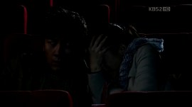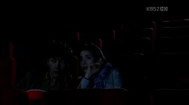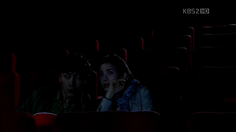 She wants to watch a movie but no one wants to come with her,so she wants to watch it with him. Off they go to the cinema, where they’re the only audiences. Ji-Won explains what is happening to Sun-Woo but soon screams when she’s scared. Sun-Woo tells her to explain first before screaming. She tries to do so but again, she gets scared and starts screaming while closing her eyes. He chuckles at her reaction.
