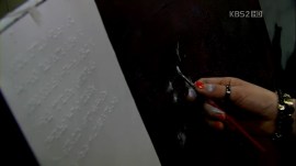 At his small house, Sun-Woo realizes that the paper he used to write his thoughts is missing. The paper is now in Soo-Mi’s hands, who tries to create a painting based on the Braille script.