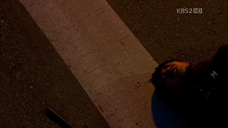 The traffic light is red and Sun-Woo crosses the road after hearing the signal. Unfortunately, a group of bikers don’t stop and hits him. He falls on the road and tries to retrieve his cane, but it’s broken. The rain pours and Sun-Woo laughs at his inability to do anything, even for himself.