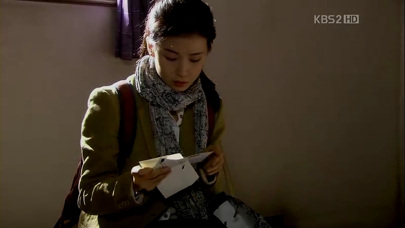 Ji-Won looks around and sees the letter Sun-Woo wrote for her. She reads the letter with as Sun-Woo reads it in a voice over, her eyes already brimming with tears.