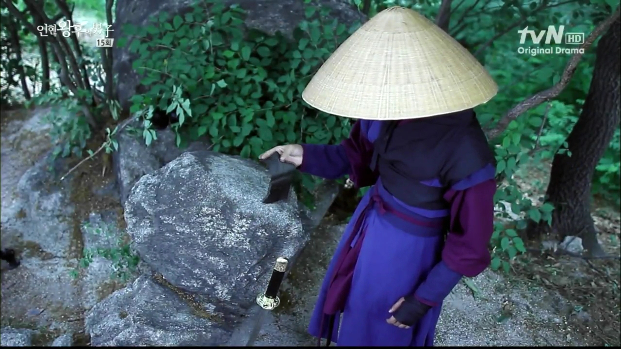 Commoners usually tie a sash-like fabric to hide their manggeon and forehead, then go out without putting on any kind of hat but when they’re traveling quite far, they will wear a conical hat, satgat (삿갓) to protect themselves from the heat or rain.
