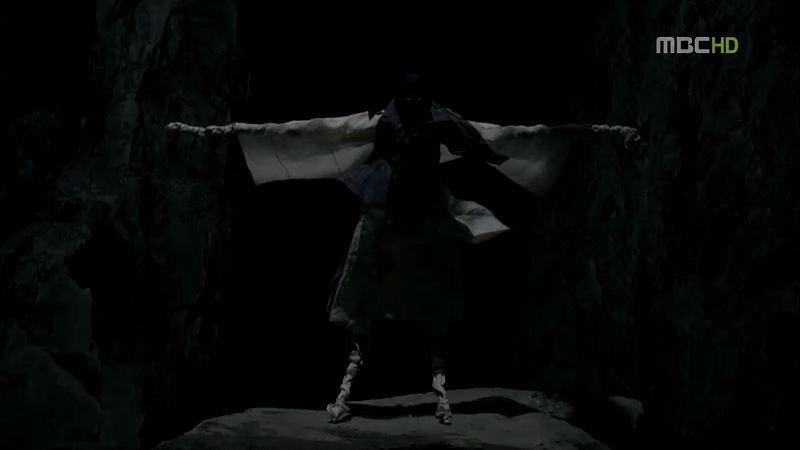 A white figure sits far away in front of her….the Jade Emperor? Sadly, it’s not. The white figure suddenly rises, revealing his eerily long limbs. Arang looks at him with fear and then asks Moo young whether he lied to her. Moo young doesn’t even flinch as the figure flies towards Arang and stops in front of her, his face directly in front of hers. Creepy, because he has fire in his eyes. Nope, the fire is actually what his eyes are made up of. Super creepy.