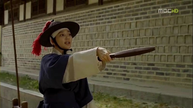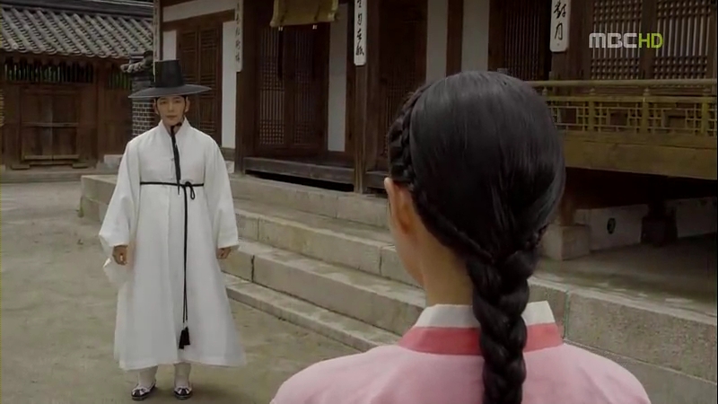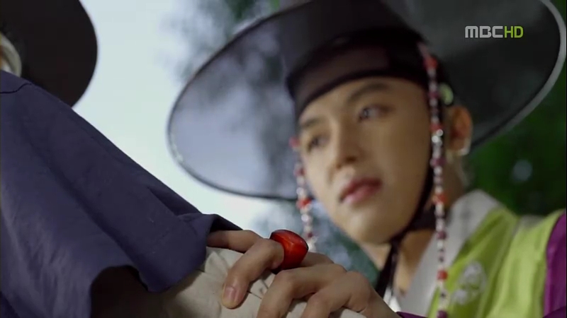 And we have our savior of the day Eun oh, tip-toeing on one foot while smiling at Dol swe. As usual, Dol swe lets out his ‘Young Master~’ squeal. Eun oh challenges the man to fight him and he’s pissed off when the man talks down to him (using informal terms with him). Eun oh warns him that his father, the previous Prime Minister won’t stand still if he’s killed,and even if that man has Lord Choi’s backing, he’ll be killed, not Lord Choi. The man retreats and leaves, but Eun oh stops him, telling him to bow to him. That man obeys, bows to him, and leaves.
