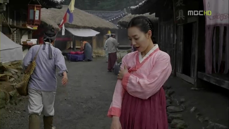 She walked around naked and found a house with some clothes hanging outside. Lucky girl. She grabbed them and wore them, but she’s surprised to see a woman squatting on the jars outside the house. It turned that the woman was a ghost, and it looked like she could still see ghosts around her! Arang bragged about her being a human and advised the ghost to take care of the jars carefully before she walked off.