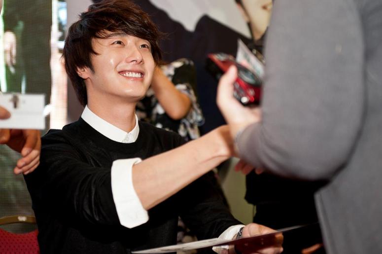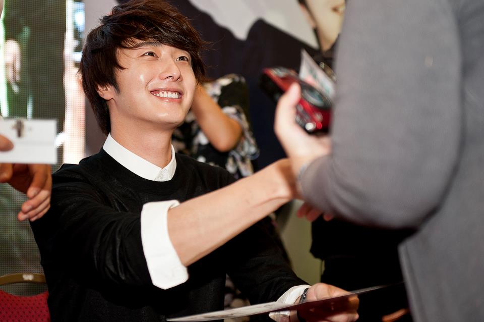 After that, the photography session for the lucky buyers were held but between the session, SNSD’s ‘Oh’ played in the background and fans started to sing the part “Oh Oh Oh o ppa reul saranghae” to him. He smiled widely. Cute! He even sang along to a song after that (couldn’t remember what the song was!).