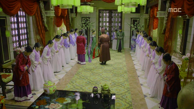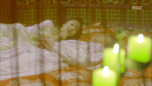Tanashiri was expecting his appearance when Ta-hwan arrived at her chamber because he had no other choice but to do so. She told the court ladies to leave them and she proceeded to take off his topcoat. He didn’t stop her but averted his gaze from meeting hers. Tanashiri spoke to him softly, telling him to look into her eyes and take off her topcoat. He did as told and lied on the bed with her. She moved closer to him but he quickly put off the light before closing his eyes. Tanashiri felt insulted with his treatment and threw a silent tantrum with tears, unlike her usual screeching self. Somehow I feel bad for her…