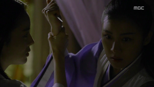 The guards on duty were sleeping soundly and Seung-nyang, thinking that it was her chance to end Ta-hwan’s life, went to him, where he was sleeping with Lady Park. She was preaching her last word to him and she’s about to strike when Lady Park woke up and blocked her. Having witnessed Seung-nyang’s silent outburst earlier, she knew the feelings of revenge and the need to kill some people, but she reminded Seung-nyang that all the Goryeo servants inside the palace would be killed if she managed to kill Ta-hwan. She told Seung-nyang that killing those people didn’t do them any justice; instead, for people like her and Seung-nyang, staying alive and witnessing the people they despised bowing to them would be the greatest form of revenge. Her words did knock some sense into Seung-nyang because she finally released the sharpened chopstick (together with her hatred) and cried.