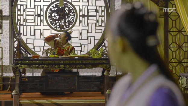 Empress Dowager made Ta-hwan sit through Dok-man playing ajaeng while Lady Park danced, something that didn’t amuse him at all. Seung-nyang started to plan her moves inside the room, from counting the people in the vicinity and her ultimate attack that was to stab Ta-hwan with the chopstick in order to avenge her father. But then, Ta-hwan felt stifled by Empress Dowager’s force for him to bear an heir to the throne as soon as possible in order to fight off Yeon-chul’s influence over him. He refused to carry on with the plan to sleep with Lady Park that night and left the room, causing Seung-nyang’s abrupt plan to be called off also instantly. He caught the sight of her but left without saying anything to her. Empress Dowager was not going to give up easily and thought of another plan: to send Lady Park to Ta-hwan’s quarters.