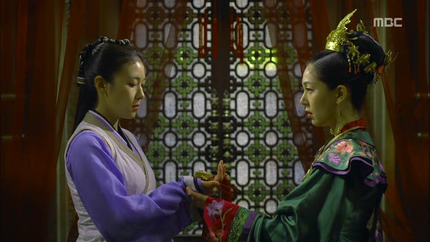 Ta-hwan continued to pat Lady Park’s back as Seung-nyang saw Tanashiri looking at them from afar. Tanashiri wanted her court lady to personally confirm that Seung-nyang would use the powder and she wanted to see Lady Park eating the poder in front of her. She walked away as fast as possible and she silently blame Ta-hwan for everything that she would do later. Lady Park was invited to meet her afterwards and she remarked (in a sharp tone) that she dreamed of a fish jumping into her arms, but she didn’t end up being pregnant; instead, Lady Park was. Tanashiri put on a happy face, saying that she’s the person the child would call ‘Mother’ later and told Lady Park to take care of their child. She wanted to spend some time once a day for the sake of the child and offered to let Seung-nyang to prepare the snack in case Lady Park would suspect her. Tanashiri believed that Seung-nyang would follow her order while actually, she had told Lady Park about it. Seung-nyang didn’t think it would help them if they tell Empress Dowager. Lady Park thanked her but Seung-nyang remarked that she was the one who saved her before this by not reporting her assassination attempt.