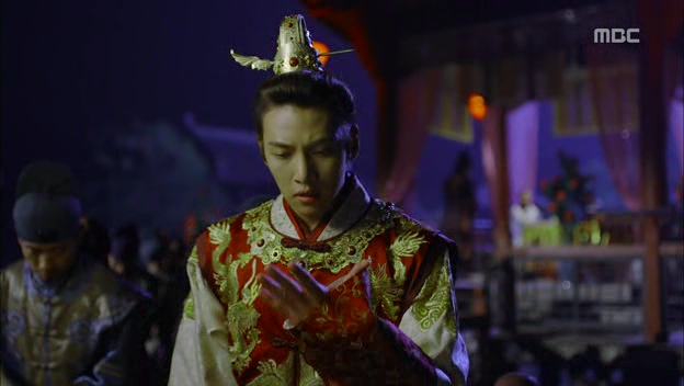 Ta-hwan had another midnight walk around the palace while thinking about the possibility of the male Seung-nyang being a woman and he found it impossible. However, he was excited when he imagined how pretty Seung-nyang would be if the man was actually a woman, dressed in fine garments and dancing gracefully, complete with her cute blinks and hearty laugh. His wonderful imagination was interrupted when Golta urged him to go back to his quarters since the wind was getting colder. He told his men not to follow him around and Golta hit the guard in frustration. Ohh…the guards are handsome!