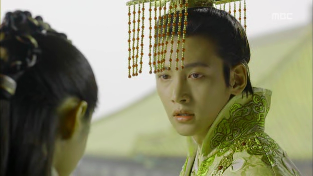 It’s bath time for our Baby Emperor but he could only think about Seung-nyang. He began to suspect that the Nyang inside the palace was the same person, but she might had resented him because of Yoo. He was upset that there was still no news from Goryeo and ordered for Seung-nyang to serve the tea, aiming to find out the truth from her. He kept staring at her all the time while reminiscing about the time he spnet together with Seung-nyang. He ordered her to lift her face up and when she looked straight into his eyes, Ta-hwan was stunned. He definitely felt something, just like what he experienced back when Seung-nyang saved him and Seung-nyang was worried that he might recognize her. Love his reaction when he clutched his heart afterwards!