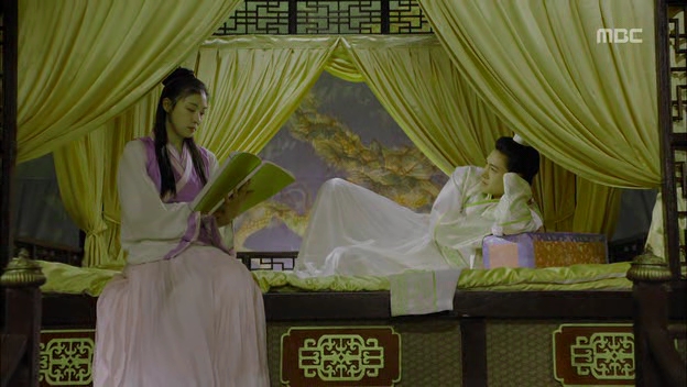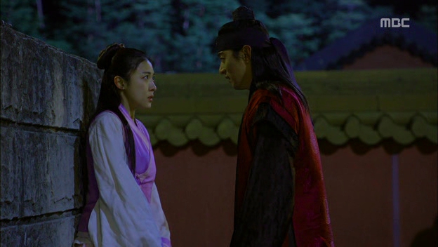 Yoo turned out to be badly scalded from the hot tea and Seung-nyang arrived, offering herself to treat him. He told her to leave, but she’s persistent enough to snatch the first aid kit from Eunuch Bang and entered his room. Moo-song let her in, knowing that it’s what Yoo wanted although he didn’t say it. Although Yoo reminded her of his order before, she pleaded him to let her treat the wound.