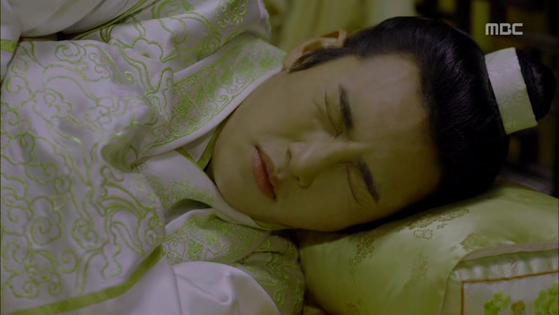 Meanwhile, Yoo was tossing and turning on his bed, unable to sleep. Someone was at the door and he woke up excitedly with a smile, but it turned out to be Eunuch Bang, bearing him something to drink. Awwwww…Yoo, are you thinking it was Seung-nyang coming to you? He was so disappointed but still hoping that she would come…
