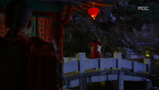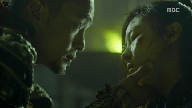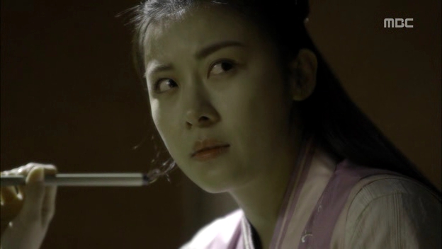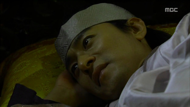 Seung-nyang nearly cried when she saw how bad it was and Yoo didn’t stop her from applying the medicine. She attended to him tenderly and blamed herself for causing the injury, only to have him warning her not to chide herself in front of him again. Moo-song informed her that Golta came to fetch her and Seung-nyang promised to drop by later at night, knowing that it would be harder for him to deal with the wound at night. Yoo told her not to do so, but when she left, he let out a sigh and everything was clearly shown on his face: his pain and his longing.