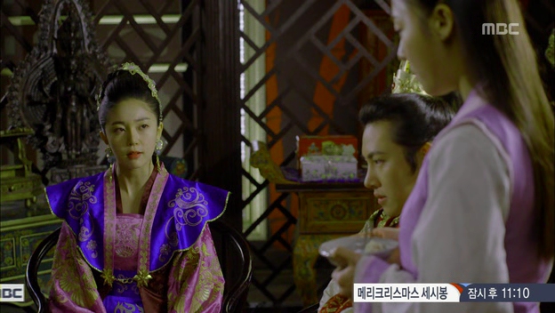 They greeted the Empress Dowager and she wondered why Tanashiri was there although she released her from the morning greetings. Empress Dowager was clearly annoyed with the bratty Empress! Ta-hwan called for Seung-nyang and ordered her to serve the tea since he couldn’t drink the tea if it’s not her serving it. Yeon-hwa, who was preparing the tea, had to step aside for Seung-nyang to take over.