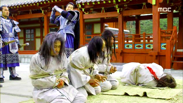 The people from the Generals’ side were brought in for a trial because of the attack/treason and they were asked for their involvement in the rumour regarding the Blood Letter. They didn’t admit it and Ta-hwan, having no other way to escape, had to order their execution per Yeon-chul’s ‘advice’. Yoo, Baek Ahn, and Taltal were all fidgety throughout the trial, afraid that the people would inflict them as accomplices but nothing happened so far. One of the men finally opened his mouth (because he seemed to have made an agreement with Dangkise), accusing Empress Dowager as the main instigator, with General Bang receiving the order to stage a coup from her. She tried to object but failed, resulting in her being dragged away from her seat to kneel on the ground. Yeon-chul cackled victoriously (but ended up coughing. HA) and Ta-hwan looked so nervous to see the Dowager being treated like that.