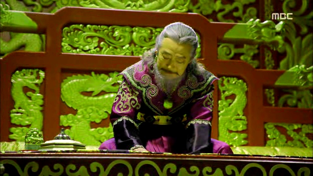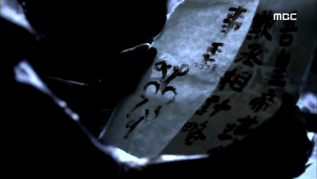 Yeon-chul already knew about Tanashiri’s pregnancy and congratulated her during their meal together with Ta-hwan (who looked so bored all the time). Dangkise dropped by, asking for a permission from Tanashiri to conduct a search inside the harem. However, Tanashiri refused to allow it since it was against the rule of the court and Ta-hwan gladly suggested that the search was to conducted by the court ladies. Yeon-chul also heard that Jeok-ho had made his escape but first, he told Dangkise to find animal blood to make a fake blood letter. Sneaky old man. He made it that the late Emperor was apologizing to Ta-hwan and telling his son to trust Yeon-chul. Pfft. He put the imperial seal on the fake letter, something that was different from the original butterfly sign…
