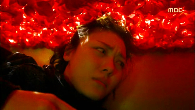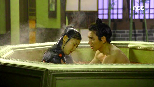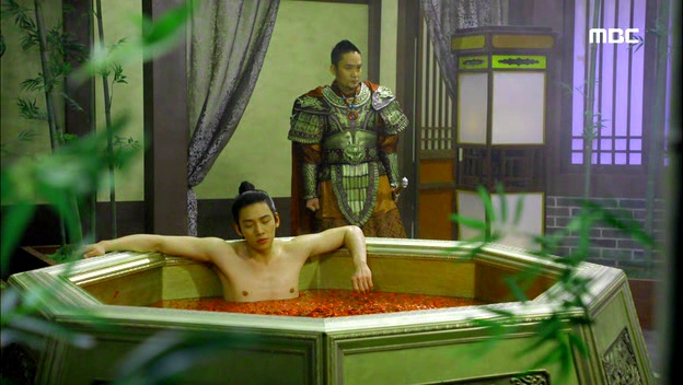 …and Ta-hwan was having his broody time in the tub filled with rose petals while Seung-nyang was hiding underwater inside the same tub. Dangkise wanted to wait until he finished his bath to conduct a search around the place but at the same time, Ta-hwan realized that Seung-nyang was running out of oxygen underwater. She soon passed out and Ta-hwan saw it. He took a deep breath and immersed himself inside the water….